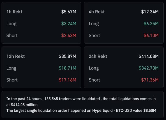 Earlier in the day, bullish PCE data sparked a sharp jump in BTC and ETH, but the momentum evaporated fast. Within 30 minutes, nearly $100 million in long positions vanished in fresh crypto liquidations. The total has now climbed above $414 million for this session alone.