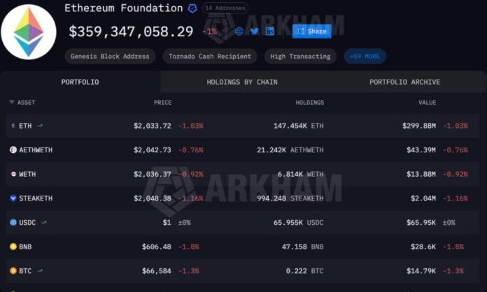 The Ethereum Foundation just locked up another 22,517 ETH – worth approximately $46.2 million – bringing its total staking position to 24,623 ETH, or roughly $50 million, according to on-chain data from Arkham Intelligence.
