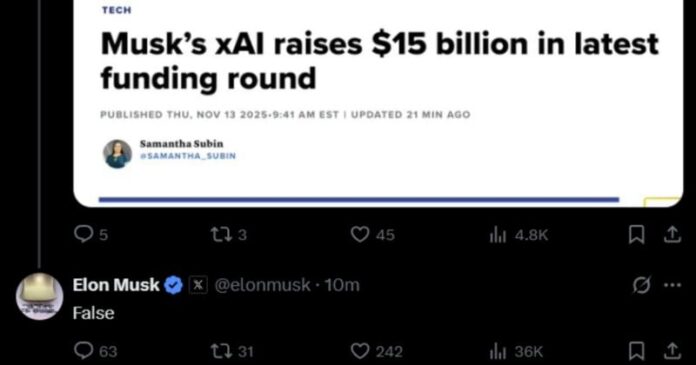 Elon Musk on Thursday denied a report about xAI, his AI startup, raising new capital, calling it “false.” The firm was said to have secured $15 billion in funding, bringing its total valuation to approximately $200 billion.