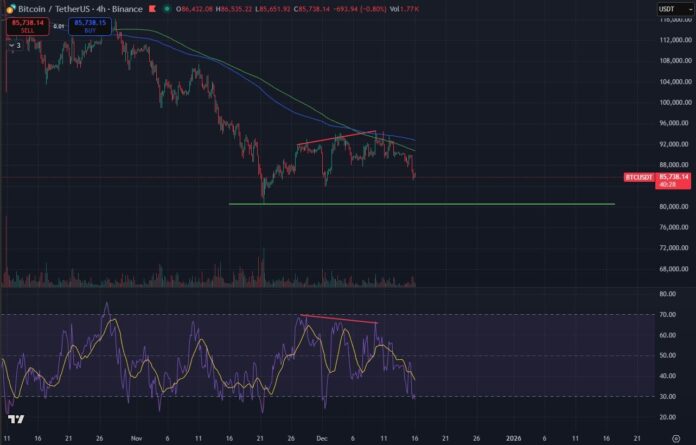 Momentum indicators also warned of trouble early. A bearish divergence in the RSI signaled weakening buying pressure even as the BTC price pushed higher, as we noted previously. That divergence has now reversed, confirming that bulls were losing control.