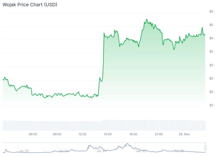 The Wojak team announced that it “officially launched on the Solana blockchain” on November 21, a move that has coincided with increased trading activity and new exchange listings.